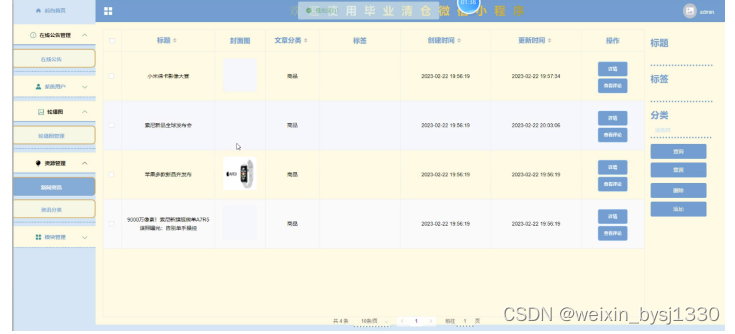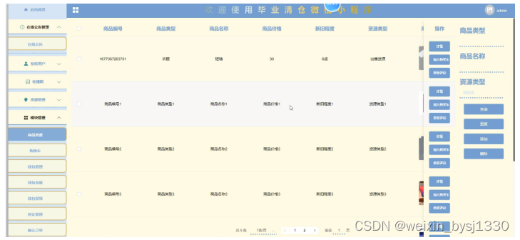 管理员登录进入毕业清仓微信小程序可以查看:首页、在线公告管理(在线公告)、系统用户(管理员、学生用户)、轮播图(轮播图管理)、资源管路(新闻资讯、资讯分类)、模块管理(商品资源、购物车、钱包管理、钱包充值、钱包提现、地址管理、确认订单、订单支付)功能信息进行相应操作,如图5-7所示。