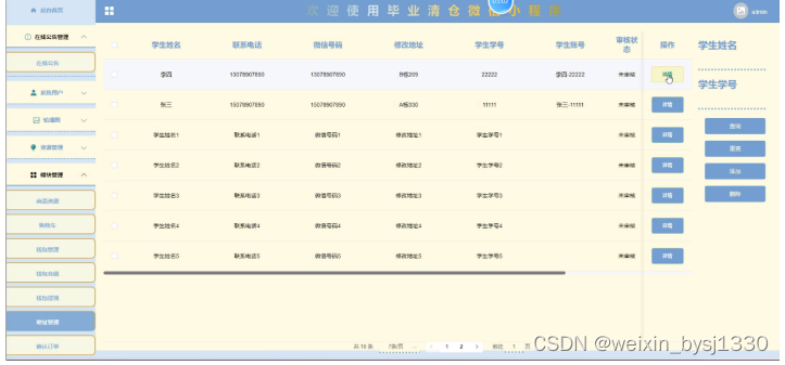 地址管理,在地址管理页面中可以对学生姓名、联系电话、微信号码、修改地址、学生学号、学生账户、审核状态等信息,进行添加或删除等操作,如图5-11所示。