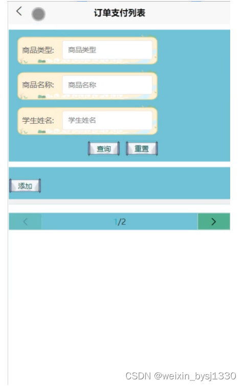 订单支付;列表,在订单支付页面可查看商品类型、商品名称、学生姓名等信息,进行添加、查询、删除如图5-5所示。