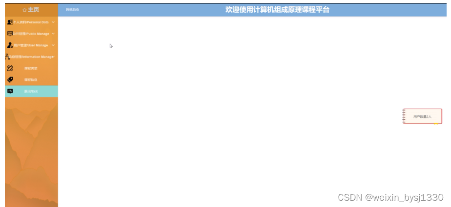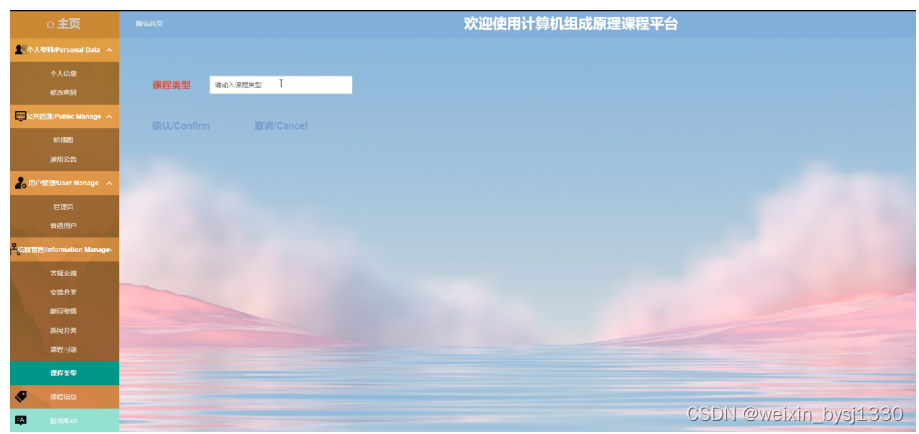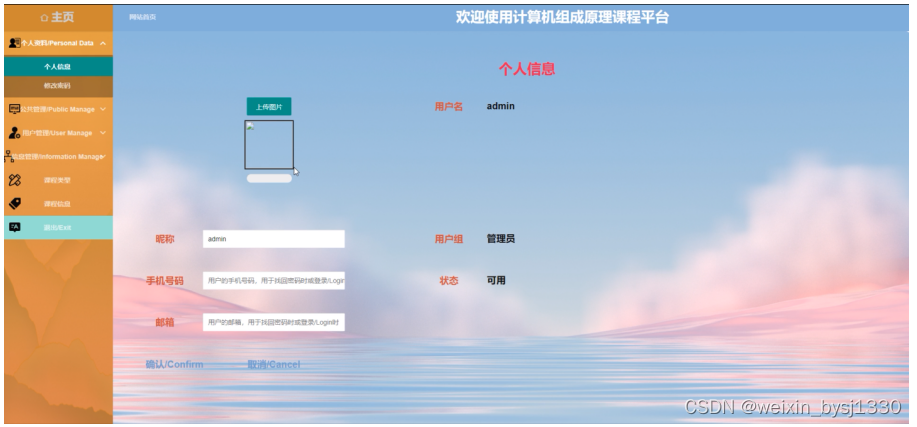管理员登录进入计算机组成原理课程平台可以查看主页、个人资料(个人信息、修改密码)、公共管理(轮播图、通知公告)用户管理(管理员、普通用户)信息管理(答疑交流、交流分类、新闻资讯、资讯分类、课程习题)课程类型、课程信息等功能。如图5-2所示。