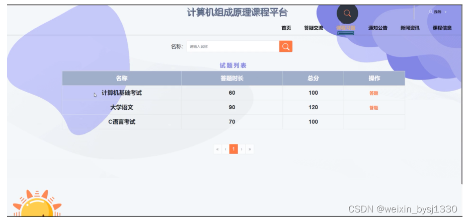 课程习题:用户在此页面通过搜索名称查找课程习题查看试题,可进行在线答题,查看分数等,如图5-18 5-19所示。