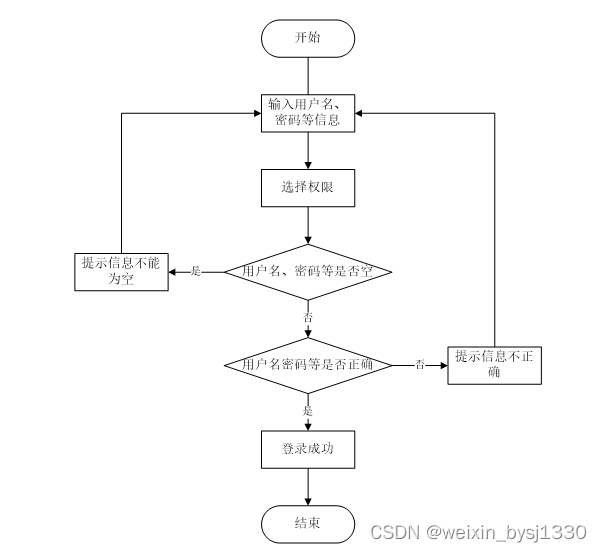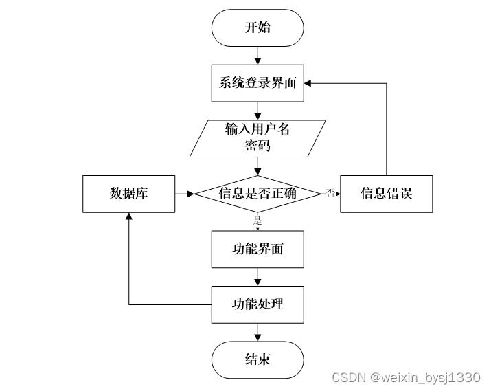 用户打开并进入系统后,会先显示登录界面,输入正确的用户名和密码,系统自动检测信息,若信息无误,则用户会进入系统功能界面,进行操作,否则会提示错误无法登录,操作流程如图3-3所示。