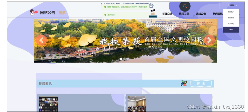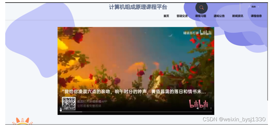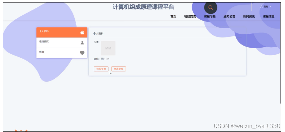 用户登录进入计算机组成原理课程平台可以查看首页、答疑交流、课程习题、新闻资讯、课程信息、通知公告、我的(我的账户、我的收藏、个人中心)等内容,如图5-11所示。
