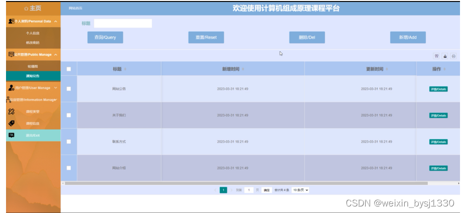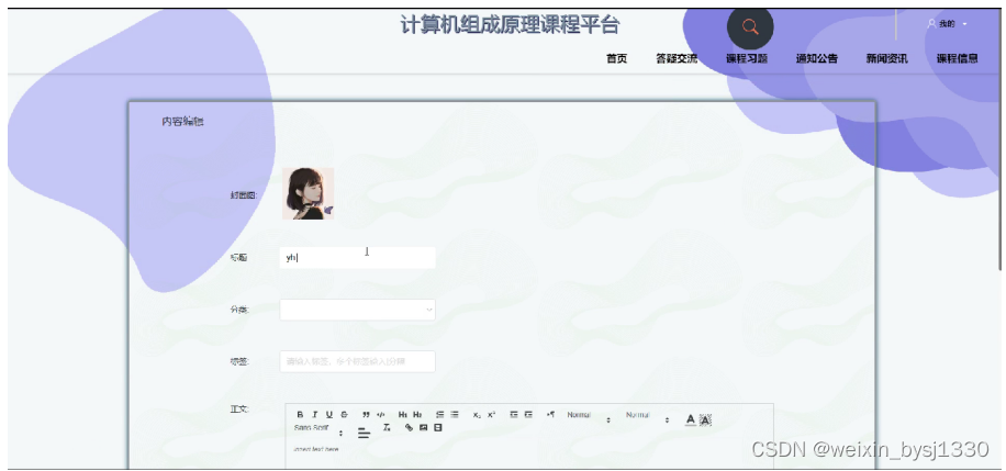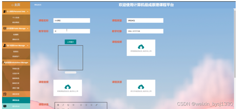 This article uses Java as the development technology to implement an SSM computer composition principle course platform. The main users of the computer composition principle course platform are divided into administrators and ordinary users. The main functions of this system include: personal data (personal information, password modification), public management (broadcast charts, notification announcements), user management (administrators, ordinary users), information management (question answering and communication, communication classification, news information, information classification, course exercises), course types, course information, and other functions. Through the design of these functional modules, the entire process of computer composition principle course platform management has been basically realized.