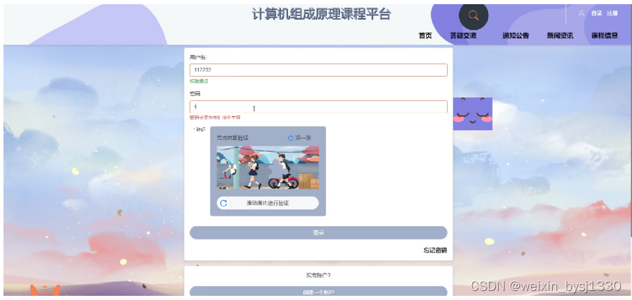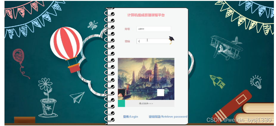 管理员登录,通过填写注册时输入的用户名、密码、滑动滑块进行验证登录,如图5-1所示。