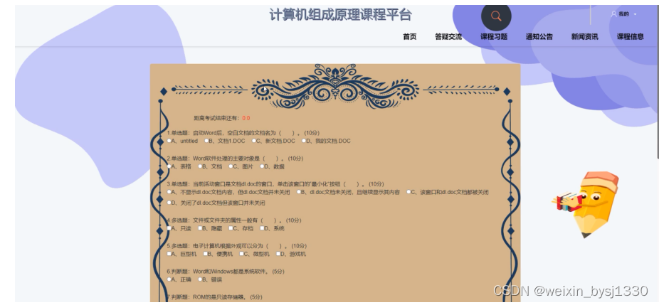 具体在系统设计上,采用了B/S的结构,同时,也使用java技术在动态页面上进行了设计,后台上采用Mysql数据库,是一个非常优秀的计算机组成原理课程平台。
