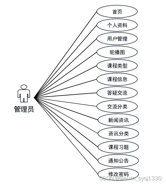 系统中的核心用户是系统管理员,管理员登录后,通过管理员菜单来管理后台系统。主要功能有:主页、个人资料(个人信息、修改密码)、公共管理(轮播图、通知公告)用户管理(管理员、普通用户)信息管理(答疑交流、交流分类、新闻资讯、资讯分类、课程习题)课程类型、课程信息等功能。管理员用例如图3-7所示。