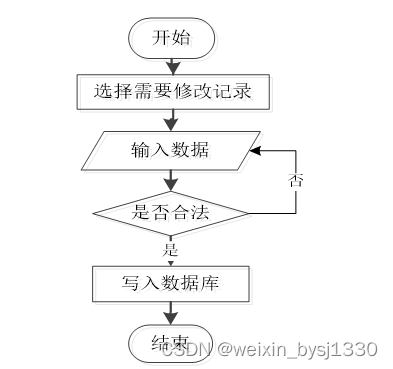 管理员可以对信息等进行的修改,用户也可以对自己权限内的信息进行修改,首先进入修改信息界面,输入修改信息数据,系统进行数据的判断验证,修改信息合法则修改成功,信息更新至数据库,信息不合法则修改失败,重新输入。修改信息流程图如图3-5所示。