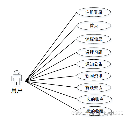 用户进入系统可以进行首页、我的(我的账户、我的收藏、个人中心)、答疑交流、课程习题、新闻资讯、课程信息、通知公告管理等。用户用例如图3-8所示。