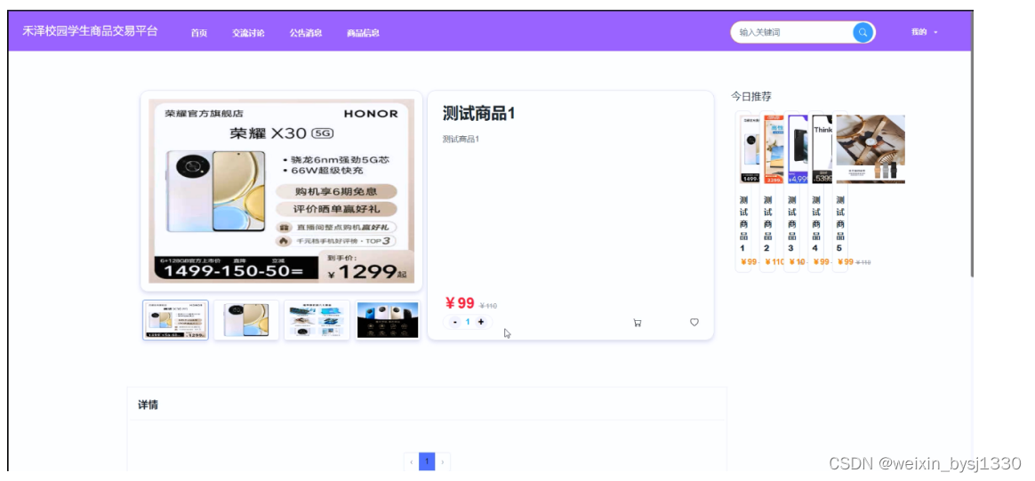 当访客点击了任意商品后将会进入该款商品的详情界面,可以了解到该商品的图片信息、商品信息、价钱信息等,同时可以对该商品进行加购+立即购买+收藏+点赞+评论。商品信息界面如图所示。