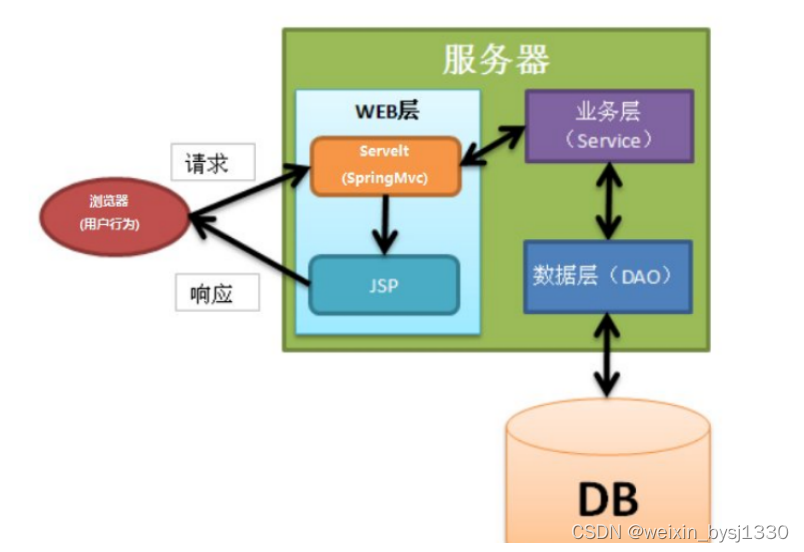 页面发送请求给控制器,控制器调用业务层处理逻辑,逻辑层向持久层发送请求,持久层与数据库交互,后将结果返回给业务层,业务层将处理逻辑发送给控制器,控制器再调用视图展现数据。