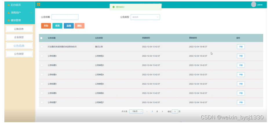 公告模块:可分为公告数据浏览、公告数据检索、公告数据维护三个模块,管理员对公告数据有维护的权限,发布新的公告数据、更新已有的公告数据等。