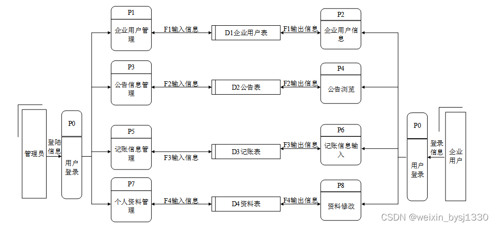 对系统的数据流进行分析,系统的使用者分为二类,一般企业用户,管理员。系统主要对界面信息传送,登录信息的验证,注册信息的接收,用户各种操作的响应做处理。