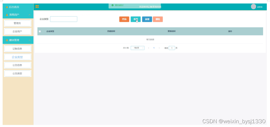 | 点击添加企业类型,必填项合法输入,点击保存 | 提示添加成功 | 与预期结果一致 |