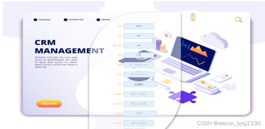 企业用户登录/注册成功之后可以修改自己的基本信息。修改页面的表单中每一个input的name值都要与实体类中的参数相匹配,在用户点击修改页面的时候,如果改后用户名与数据库里面重复了,页面会提示该用户名已经存在了,否则通过Id来查询用户,并将用户的信息修改为表单提交的数据。