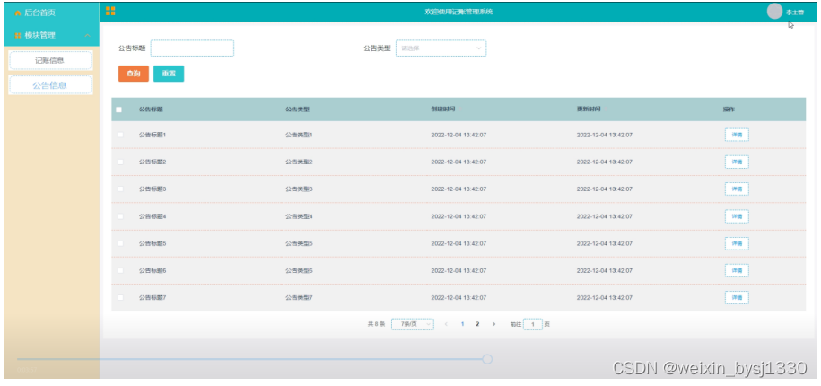 记账信息模块:记账信息管理分为记账数据添加、修改和发布。记账信息由用户进行添加操作;管理员维护管理。