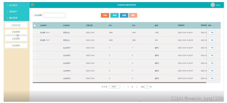 记账信息:用户可以在线进行记账信息登记,包括企业编号。企业名称、收入、支出、盈利、记账日期、账单明细等。