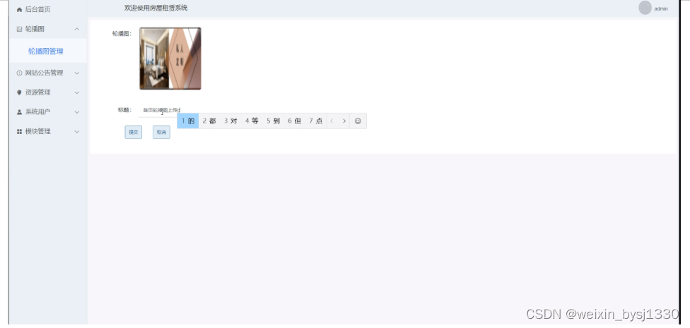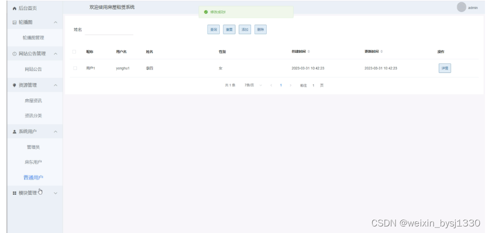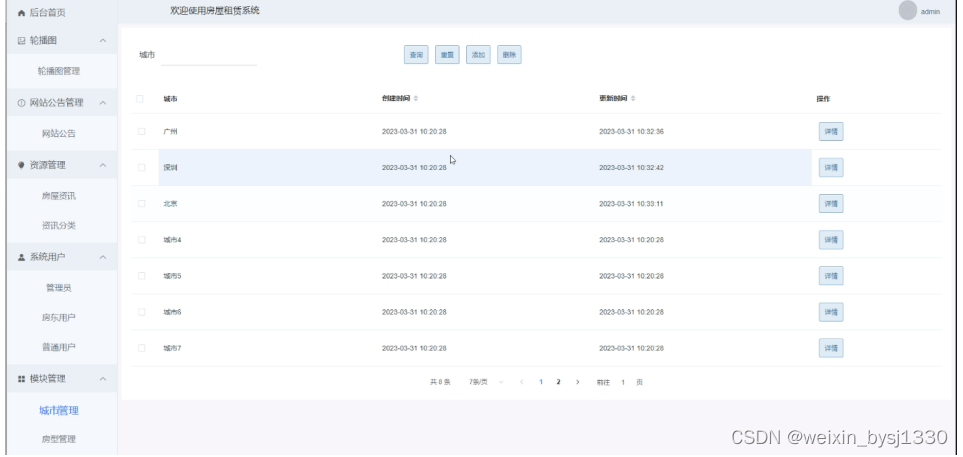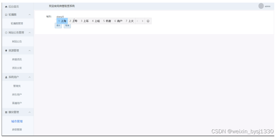 管理员登录进入房屋租赁系统可以查看:首页、轮播图(轮播图管理)、网站公告管理(网站公告)、资源管理(房屋资讯、资讯分类)、系统用户(管理员、房东用户、普通用户)、模块管理(城市管理、房型管理、房屋信息、租赁订单、租赁评价)、个人中心等功能信息进行相应操作,如图5-7所示。