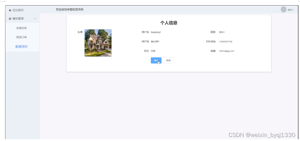 房东登录系统后台可查看功能有首页、模块(房屋信息、租赁订单、租赁评价)、个人中心等功能,图5-13