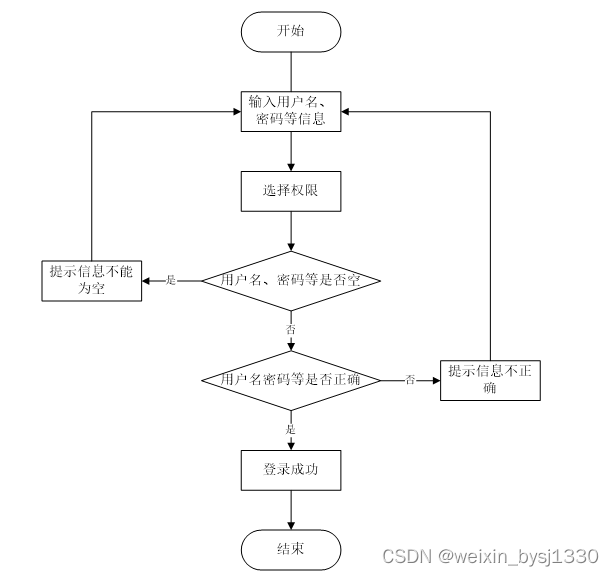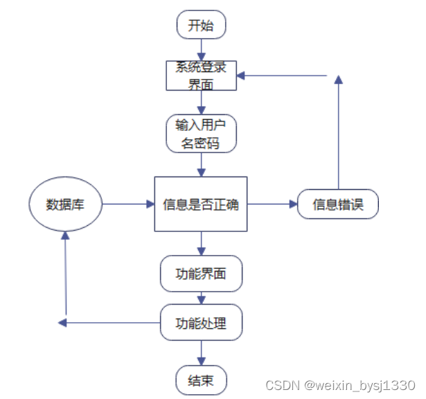 用户打开并进入系统后,会先显示登录界面,输入正确的用户名和密码,系统自动检测信息,若信息无误,则用户会进入系统功能界面,进行操作,否则会提示错误无法登录,操作流程如图3-3所示。