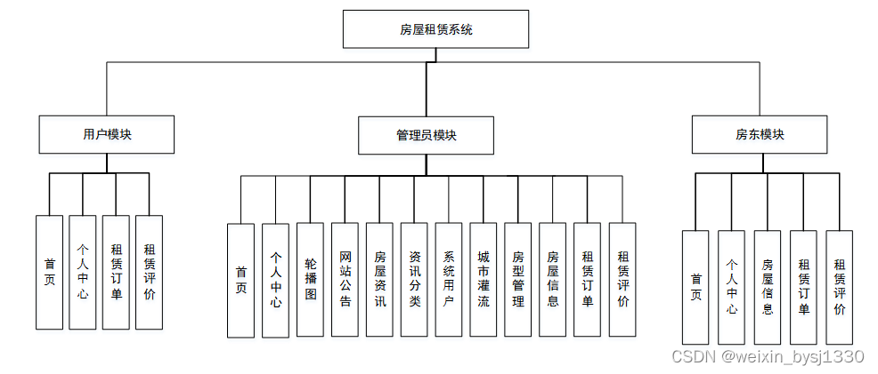 本房屋租赁系统主要包括三大功能模块,即用户功能模块、管理员功能模块和房东模块。