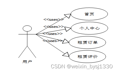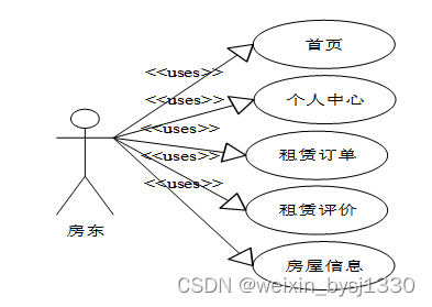 (3)房东,主要功能有:首页、模块(房屋信息、租赁订单、租赁评价)、个人中心管理。租赁用例图如图3-3所示。