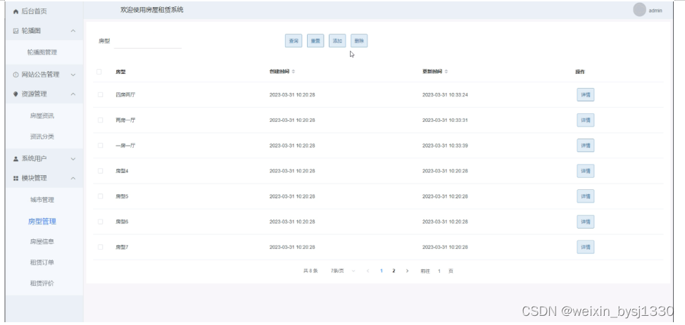 房型管理,在房型管理页面中可以看到户型房型等内容,进行添加或删除等操作,如图5-12所示。