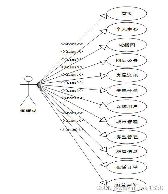 (1)管理员模块:系统中的核心用户是系统管理员,管理员登录后,通过管理员菜单来管理后台系统。主要功能有:首页、轮播图(轮播图管理)、网站公告管理(网站公告)、资源管理(房屋资讯、资讯分类)、系统用户(管理员、房东用户、普通用户)、模块管理(城市管理、房型管理、房屋信息、租赁订单、租赁评价)、个人中心等。管理员用例图如图3-1所示。
