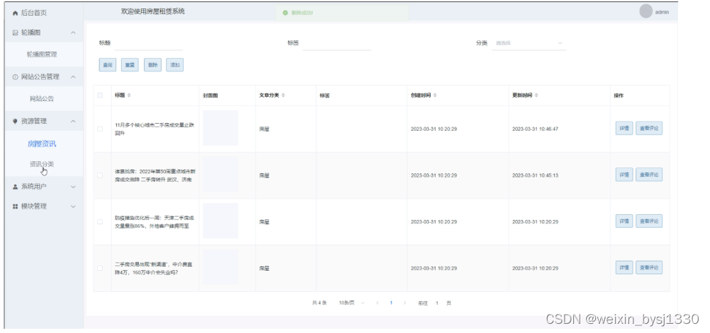 房屋资讯管理,在新闻资讯管理页面中可以对标题、标签、描述、分类、等信息进行评论、添加、删除或详细等操作,如图5-10所示。