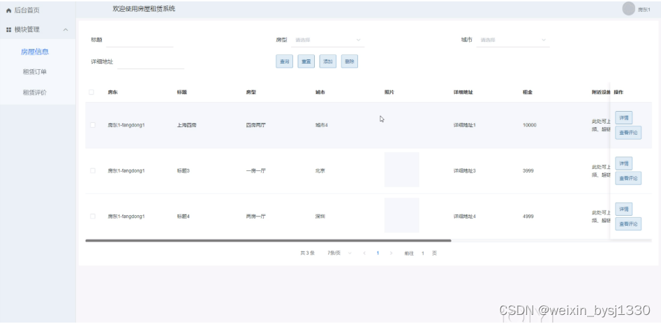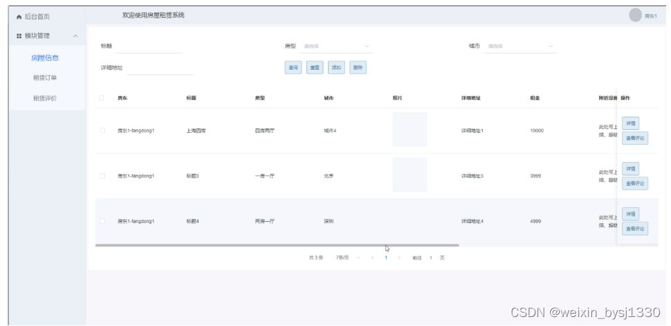 房屋信息管理,房东可以对房屋信息的房东、标题、房型、城市、照片、详细地址、租金等信息进行查看评论、添加、删除详细等操作 ,图5-15