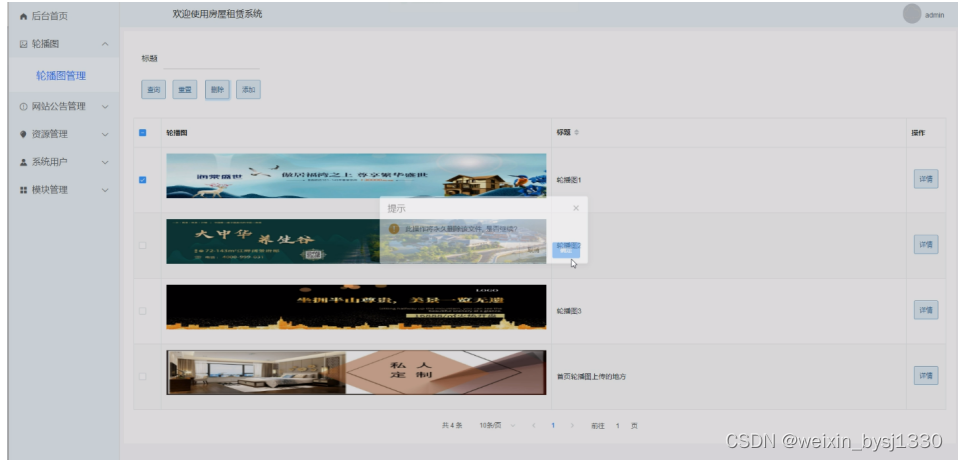 轮播图管理,在轮播图管理页面中可以添加通知信息:轮播图、标题等信息,还可在轮播图管理页面对轮播图信息进行添加、删除或详细等操作,如图5-8所示。