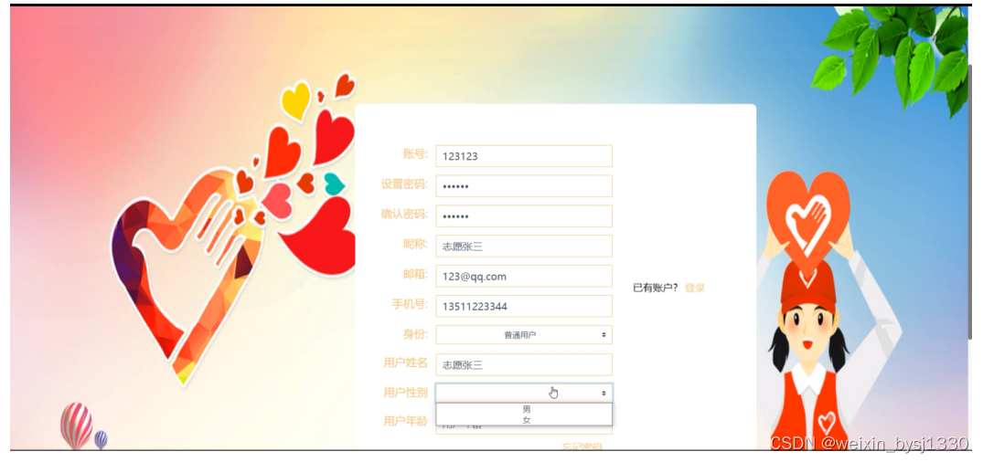 4.报名信息,用户可以在线进行申请报名志愿者信息登记。