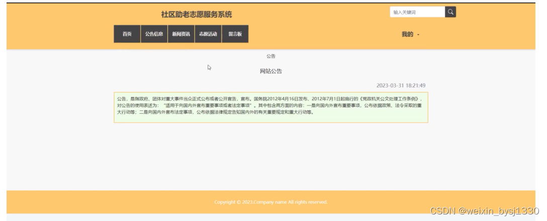 This design mainly realizes the community volunteer service system for helping the elderly, which integrates the advantages of humanization, efficiency and convenience, and completes the function modules of volunteer activities, registration information, message board, news information, etc. The system communicates with the server through the browser to realize data interaction and change. You can operate the system by moving your fingers through a computer to realize data communication management. The design process of the whole system fully considers the safety, stability and reliability of data, and the operation process is simple. The system improves work efficiency and reduces errors and omissions in data storage through scientific management and convenient services. The community volunteer service system for the elderly uses Java language, is developed based on the Springboot framework and Java technology, and is compiled using the MyEclipse 2017 CI 10 compiler. In terms of data, it mainly uses Microsoft's MySQL relational database as the data storage medium, and cooperates with the foreground HTML+CSS technology to complete the system development.