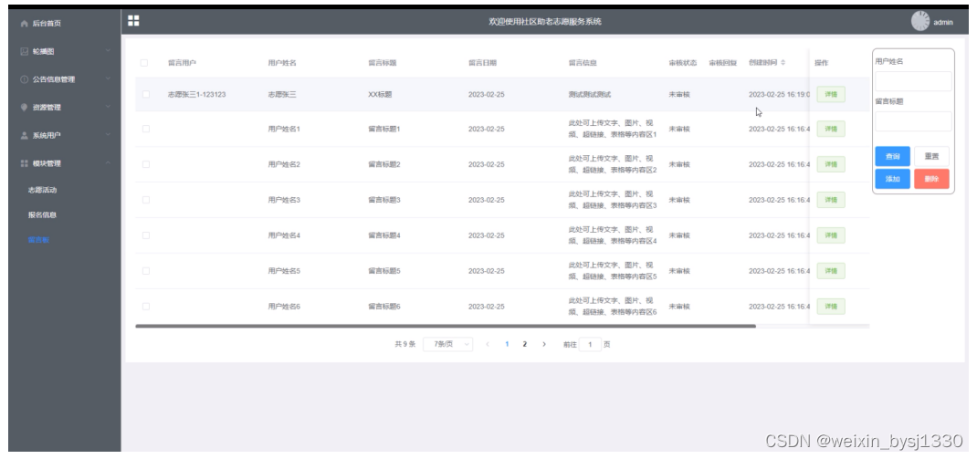 留言板管理,管理员可以对志愿者的留言信息进行审核回复,并可根据需要进行增删改查等操作,如图4-9所示。