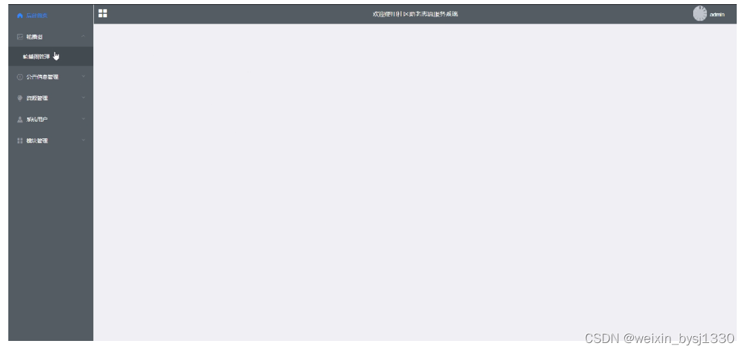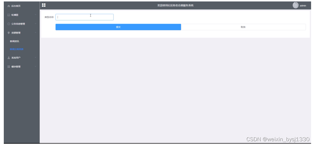 管理员登录进入社区助老志愿服务系统可以查看首页、轮播图管理、公告信息管理、系统用户(管理员、普通用户)资源管理(新闻资讯、新闻分类列表)模块管理(志愿活动、报名信息、留言板)等信息,如图4-6所示。