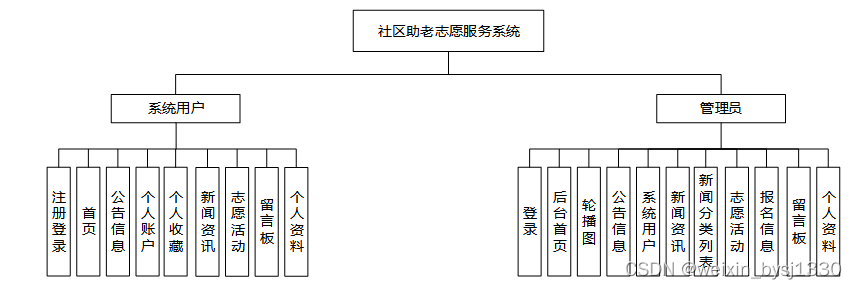 (3)确定好系统使用的技术,进行在线确认系统所划分的用户角色,并且根据用户角色划分确定所要设计的功能模块,对基于Springboot的社区助老志愿服务系统的设计主要划分用户角色,并所使用的功能模块也相应不同,但是系统的数据库实现的内容是交互的,用户可以随时根据自己的需求进行信息查看,对于系统工作人员可以根据自己的分管内容进行在线信息的处理及操作。