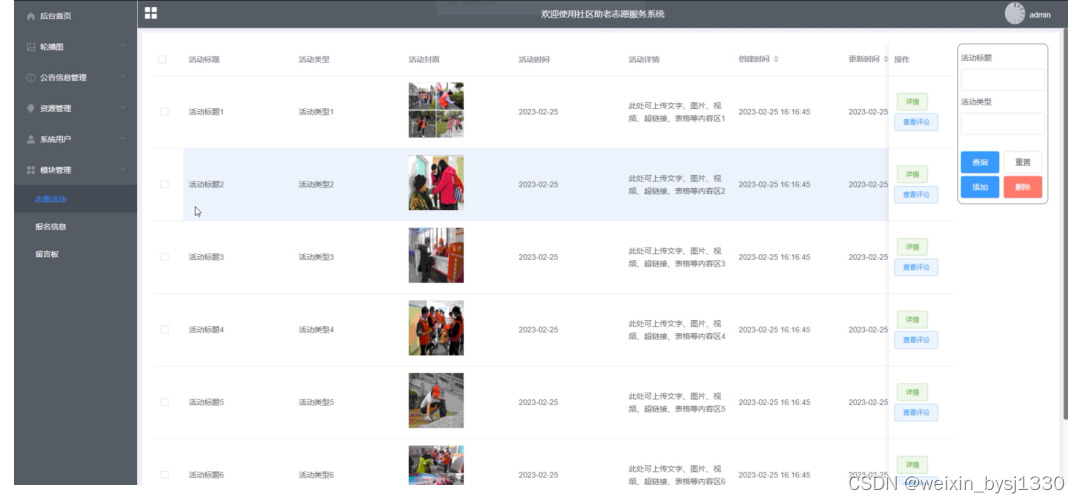 志愿活动管理,管理员在志愿活动管理中可以查看活动标题、活动类型、活动封面、活动详情、活动时间信息等详细信息,可根据需要进行增删改查等操作;如图4-8所示。