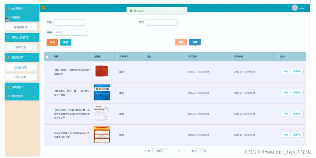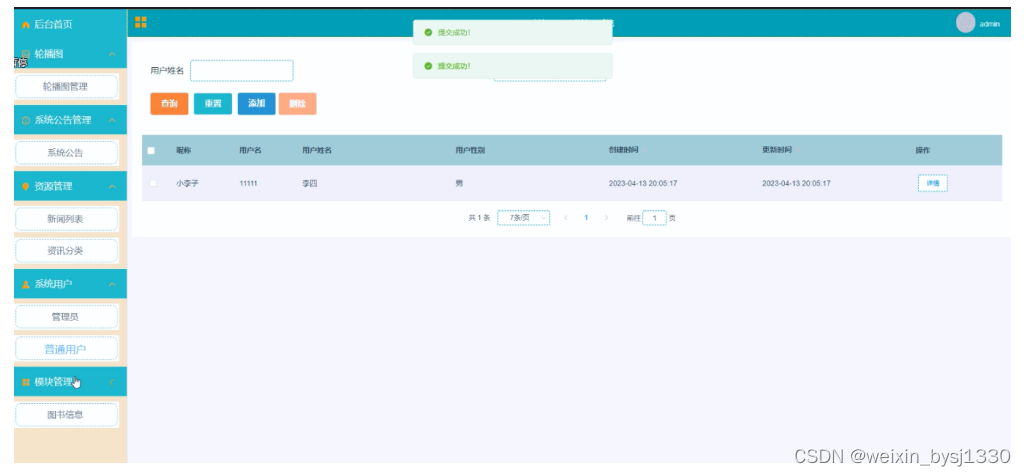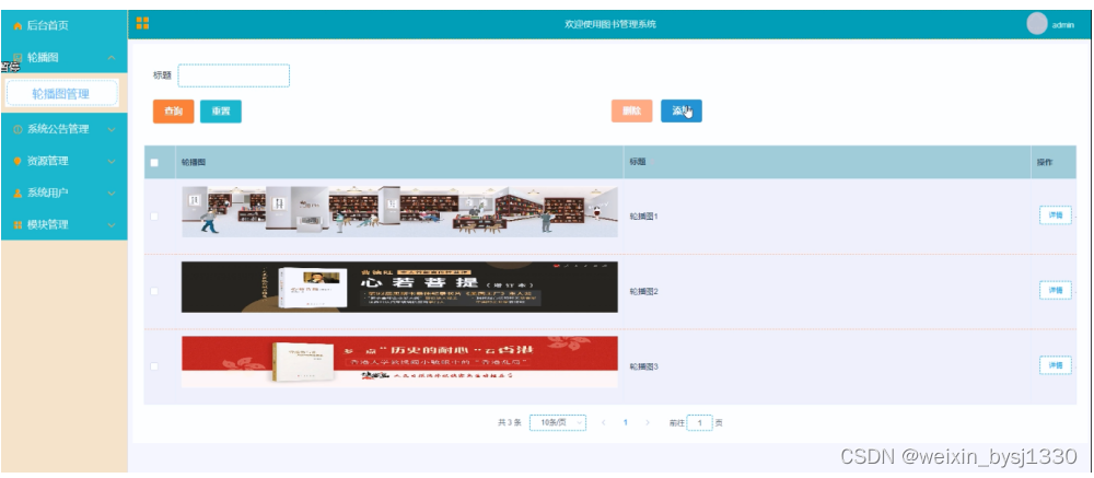(2)轮播图/系统公告管理:管理员可以对系统前台展示的轮播图+系统公告进行增删改查,方便用户进行查看。