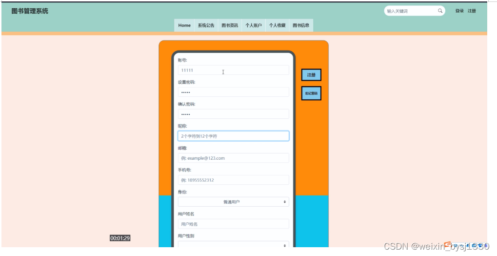 不是图书管理系统中正式用户的是可以在线进行注册的,如果你没有本图书管理系统的账号的话,添加“注册”,当填写上自己的账号+密码+确认密码+昵称+邮箱+手机号等后再点击“注册”按钮后将会先验证输入的有没有空数据,再次验证密码和确认密码是否是一样的,最后验证输入的账户名和数据库表中已经注册的账户名是否重复,只有都验证没问题后即可用户注册成功。其用用户注册界面展示如下图4-2所示。