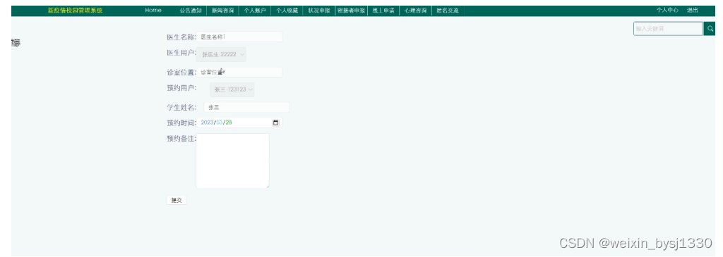 (6)申请借阅:当用户在图书信息详情界面想要进行申请借阅,点击下方的“申请借阅”按钮,就会跳转到申请借阅信息填写界面,根据界面提示输入申请借阅信息,点击“提交”按钮,申请借阅就完成了;