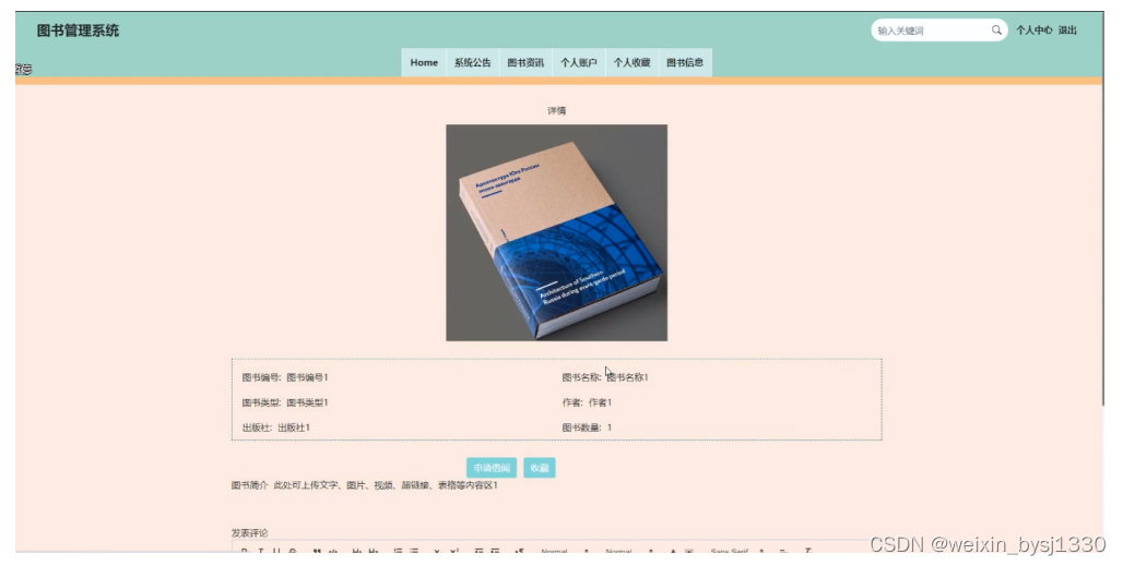 当用户点击“图书信息”这一菜单按钮,会显示管理员在后台发布的所有的图书信息,支持通过关键词对图书信息进行搜索,选择需要的图书信息点击可以进入到图书信息详细的介绍界面,在详细界面可以查看到图书的图书编号、图书类型、出版社、图书简介、图书名称、作者、图书数量等信息,同时可以进行申请借阅、收藏、评论操作,图书信息界面如下图4-6所示。