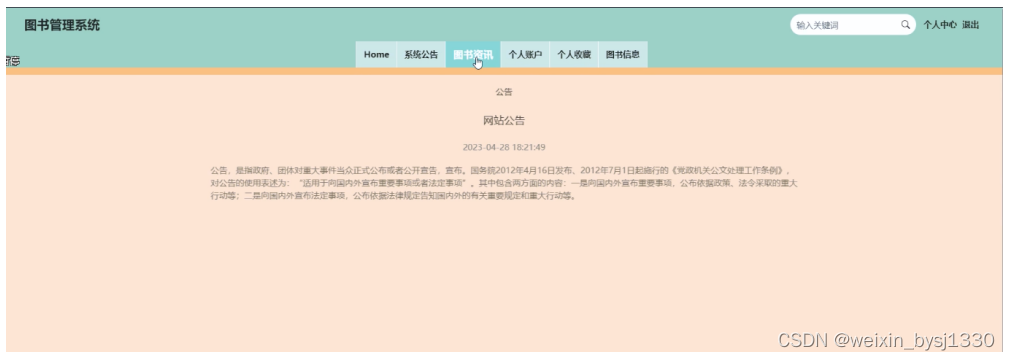 当点击导航栏上的“公告栏”的时候,就会进入对应的界面查看公告信息,公告栏界面如下图4-4所示。