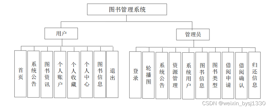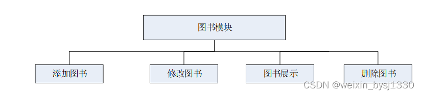 图书管理系统是中需要存储不少图书信息,其模块功能结构,具体的结构图如下: