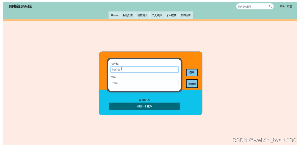 图书管理系统中的前台上注册后的用户是可以通过自己的账户名和密码进行登录的,当用户输入完整的自己的账户名和密码信息并点击“登录”按钮后,将会首先验证输入的有没有空数据,再次验证输入的账户名+密码和数据库中当前保存的用户信息是否一致,只有在一致后将会登录成功并自动跳转到图书管理系统的首页中;否则将会提示相应错误信息,用户登录界面如下图4-3所示。