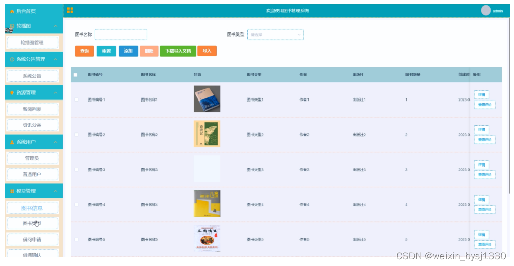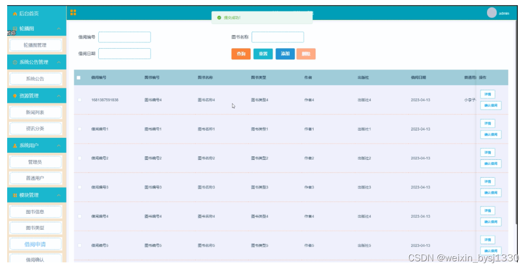 (5)模块管理:当点击“模块”这一菜单的时候,会出现图书信息+图书类型+借阅申请+借阅确认+归还信息这五个子菜单,管理员能够对五个模块进行增删改查操作;