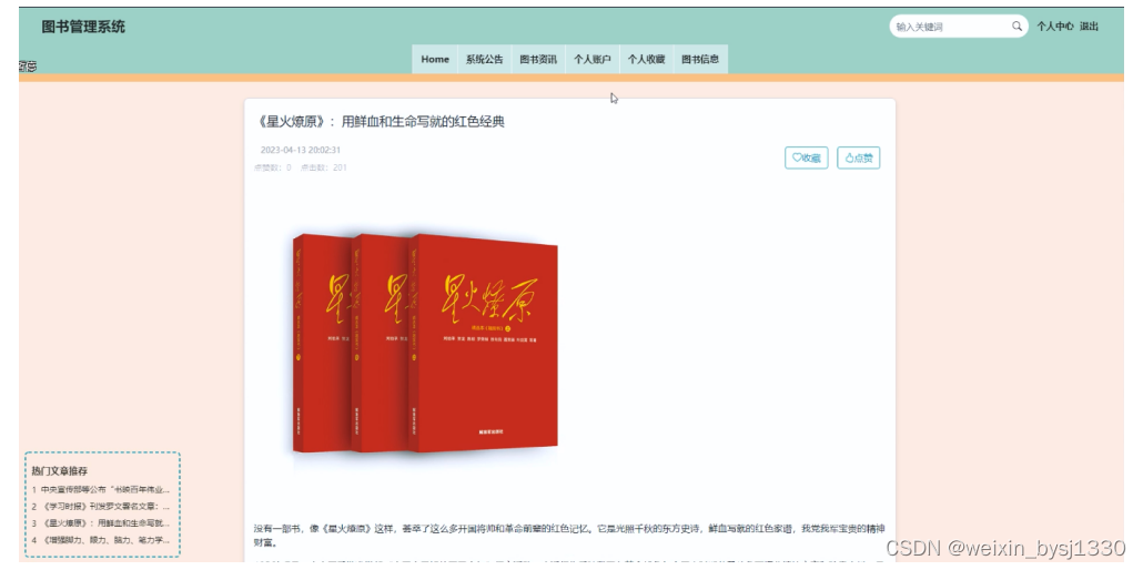(3)图书资讯:在首页导航栏上我们会看到“图书资讯”这一菜单,我们点击进入进去以后,会看到所有管理员在后台发布的图书资讯信息,能够对喜欢的图书资讯进行点赞,如果下次想要更快的找到这篇资讯,也可以进行收藏、评论;