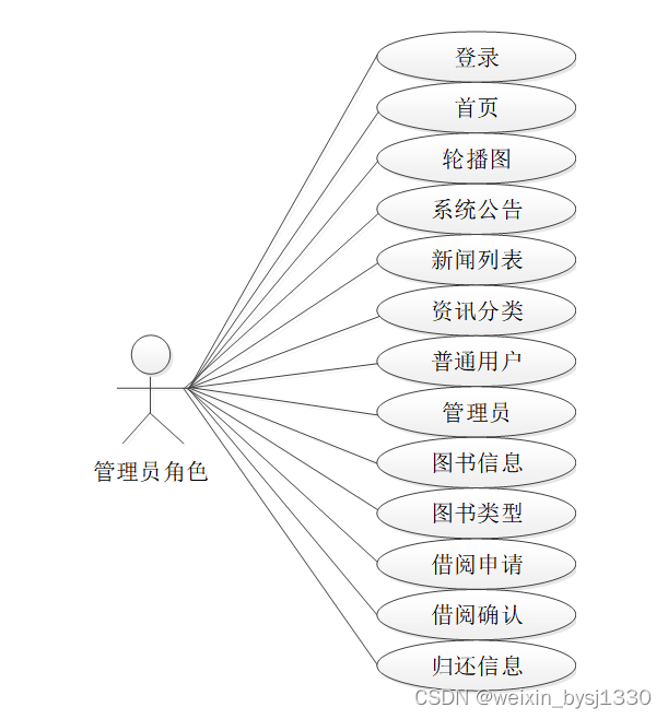 web后台管理上的管理员是维护整个图书管理系统中所有数据信息的。管理员角色用例如图2-4所示。