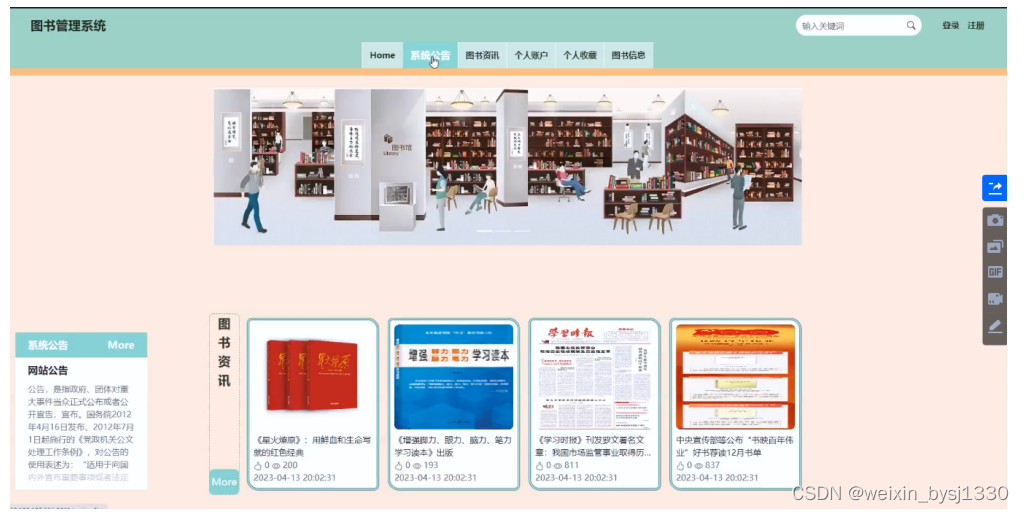 (1)注册登录:在系统的右上角有登录+注册按钮,如果用户想要登录到系统当中,可以点击“登录”按钮,然后填写号用户名+密码,点击“登录”按钮,系统会对你的用户名密码进行核对,正确的话就会登录成功了,如果没有账号的话,可以点击右上角的“注册”按钮,然后根据提示输入好用户信息,就可以得到账号和密码了;
