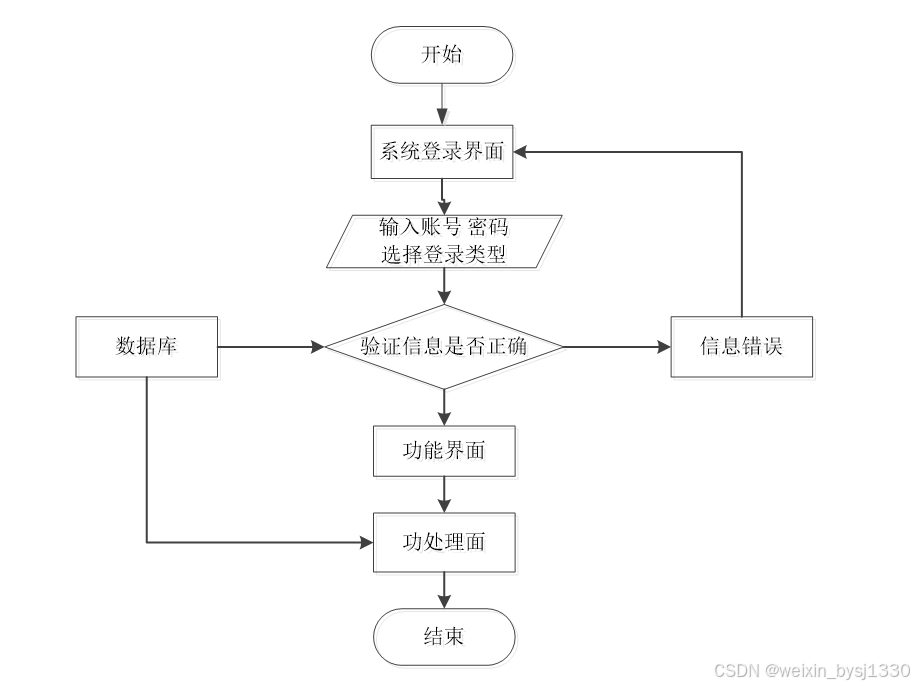 用户想进入系统,首先进入系统登录界面,通过正确的用户名、密码,选择登录类型登录,系统会检查登录信息,信息正确,然后输入相应的功能界面,提示信息错误,登录失败。系统操作流程如图3-4所示。