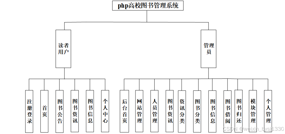 (3)确定好系统使用的技术,进行在线确认系统所划分的用户角色,并且根据用户角色划分确定所要设计的功能模块,对于高校图书管理系统的设计主要划分别为管理员和读者用户角色,并所使用的功能模块也相应不同,但是系统的数据库实现的内容是交互的,用户可以随时根据自己的需求进行信息搜索,对于系统工作人员可以根据自己的分管内容进行在线信息的处理及操作,管理员获取到所有用户的详细数据信息,并根据需求进行第一时间处理解决。